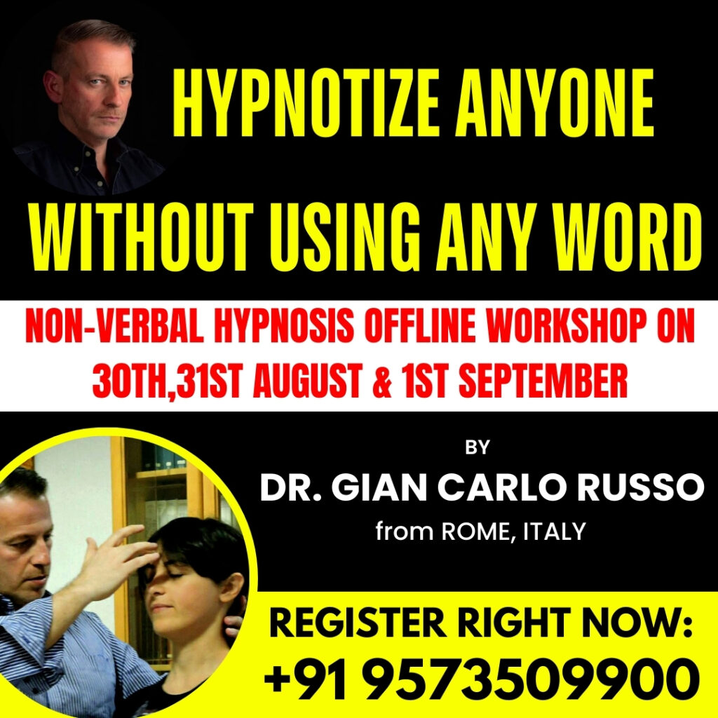 Thank You For Your Interest In Attending For The Very First Time in India LEARN HOW TO HYPNOTIZE ANYONE WITHOUT USING ANY WORD (NON VERBALLY) IN 30 SECONDS OR LESS BY GIAN CARLO RUSSO (ROME ITALY) Date: 30th & 31st August And 1st September 2024 For More Details Join the Whatsapp Group CLICK TO JOIN WHATSAPP GROUP
